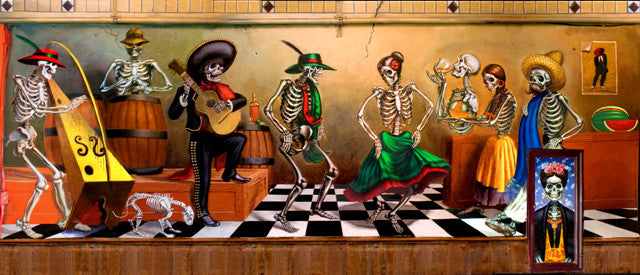 "El Gran Fandango" was inspired by a 1910 zinc etching by Jose Guadalupe Posada. The painting you see here was originally a large scale mural painted by renown artist Francisco Franco and was done in the dance-of-death and 'memento mori traditions (skulls and death-goddesses are common in pre-Columbian art) and the Spanish heritage.