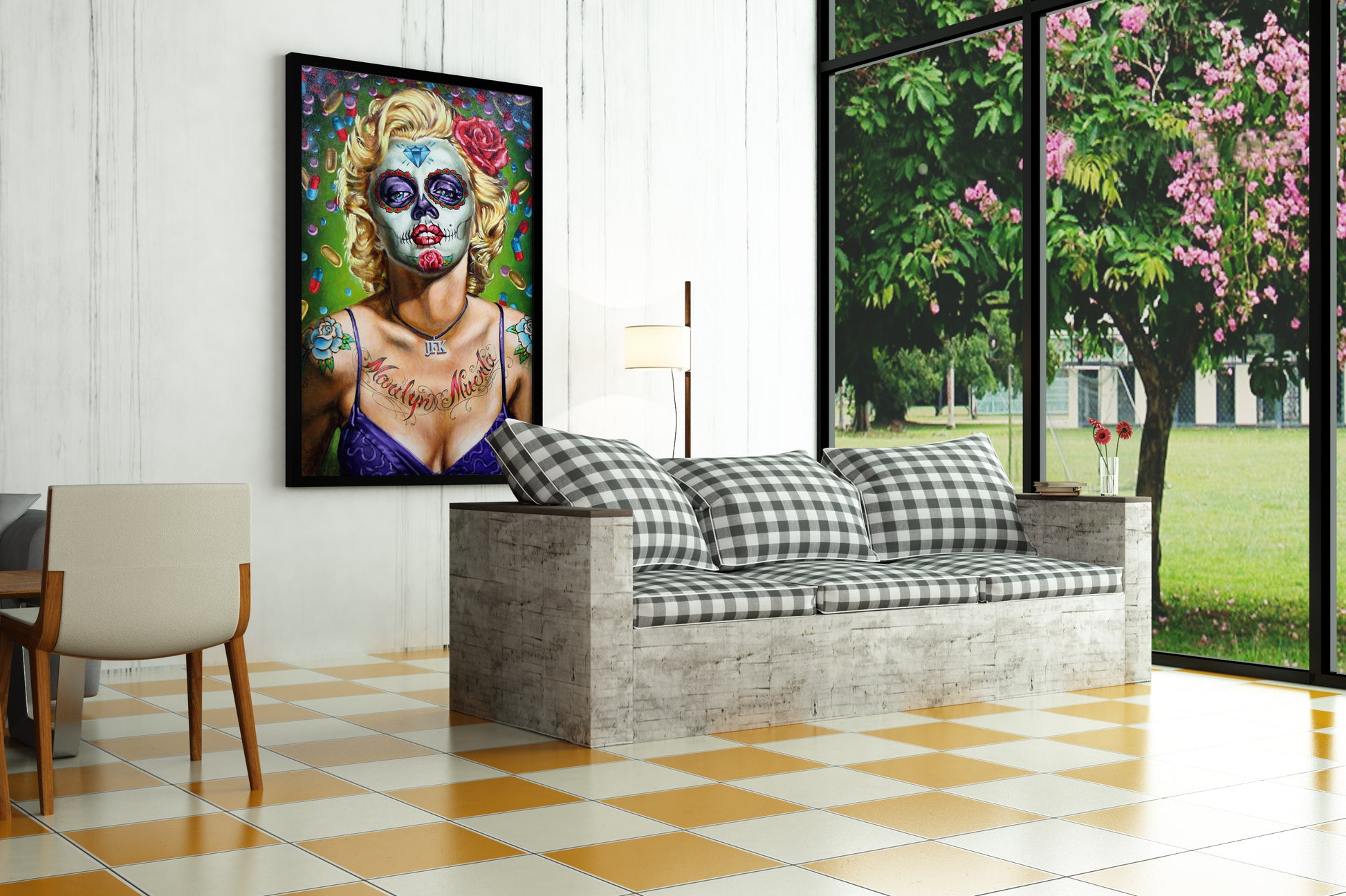 Day of the Dead inspired portrait of Marilyn Monroe by renown artist Francisco Franco. This is a giclee (zhee-klay) print, an individually produced, high-resolution, high-fidelity, high tech reproduction done on a special large format printer. Giclees are produced from digital scans of existing artwork.
