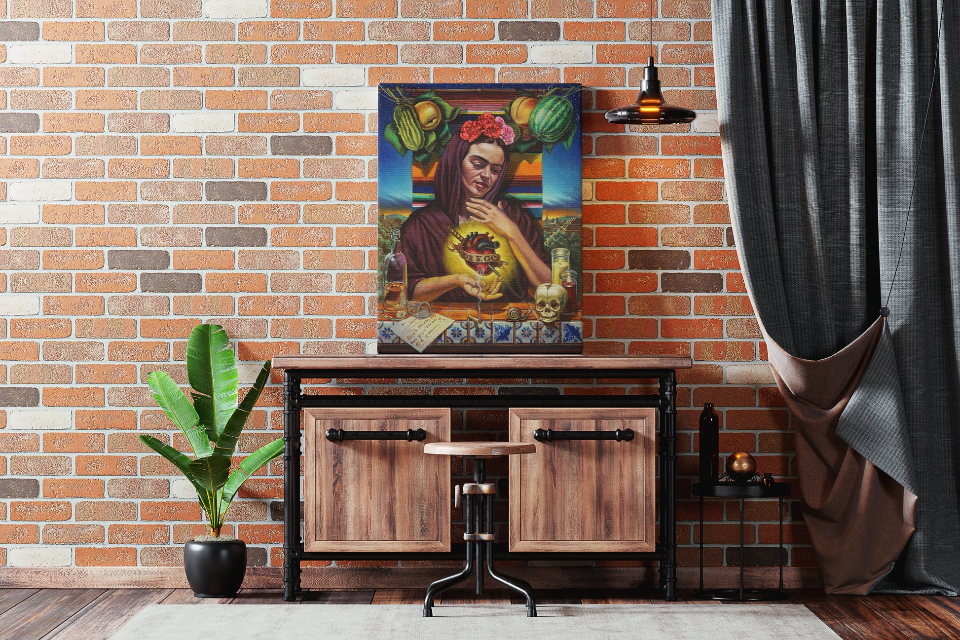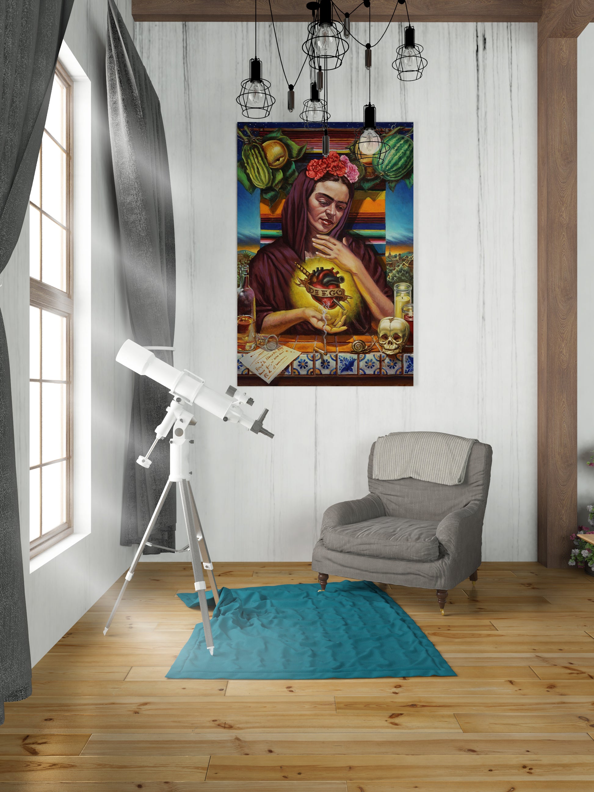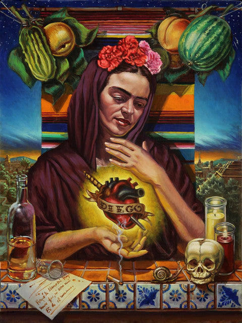 This is an imagined biographical portrait of Frida Kahlo painted by renown California Artist Francisco Franco. The original 18" x 24" oil painting on wood panel was completed in July 2014.