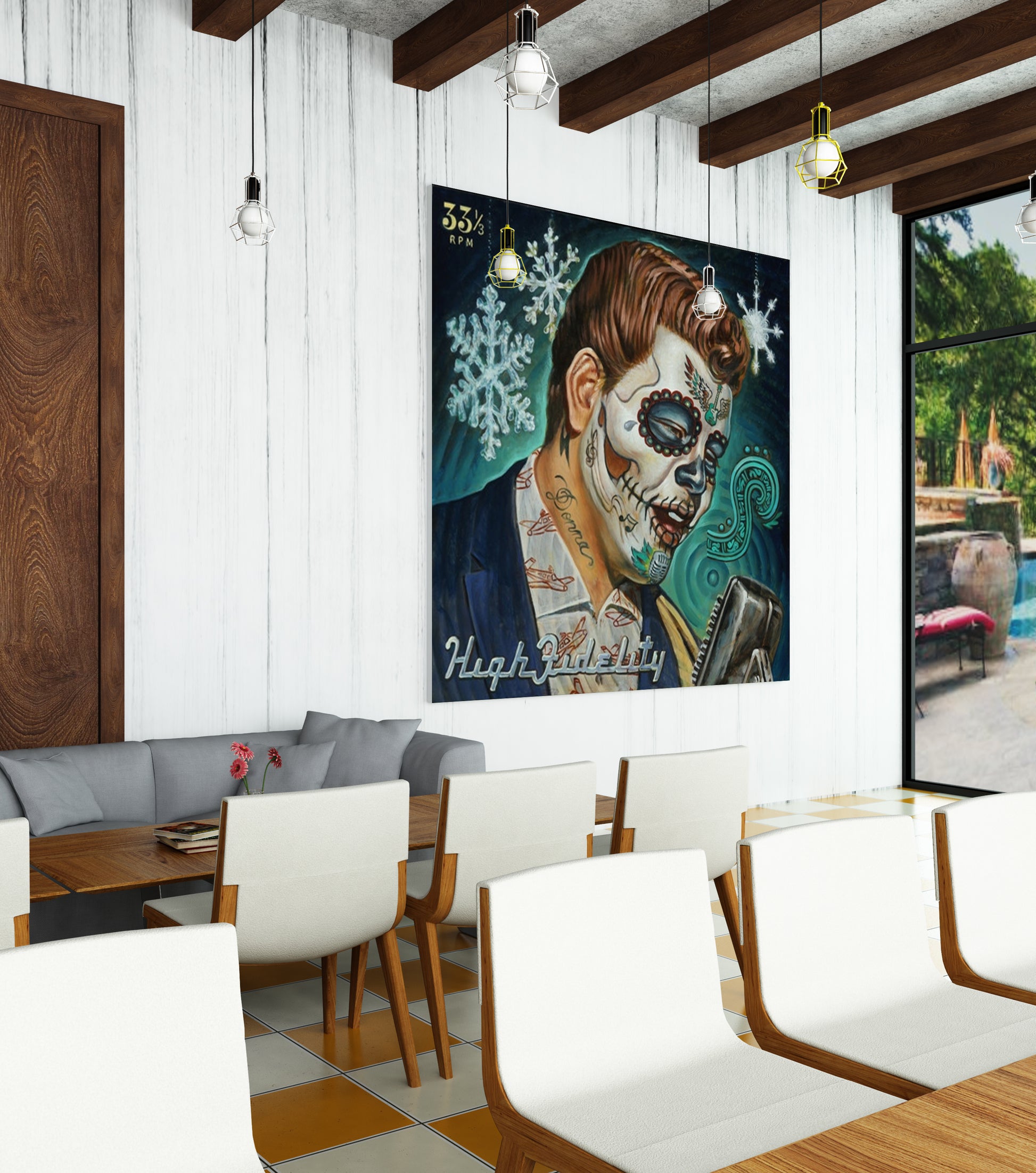'The Day the Music Died' is a Day of the Dead inspired portrait of Richard Steven Valenzuela (May 13, 1941 – February 3, 1959), known as Ritchie Valens, was an American singer, songwriter and guitarist. A rock and roll pioneer and a forefather of the Chicano Rock movement, Valens' recording career lasted eight months, as it abruptly ended when he died in a plane crash, on February 3, 1959, on what has become known as "The Day the Music Died". The work is painted by renown artist Francisco Franco. This is a giclee (zhee-klay) print, an individually produced, high-resolution, high-fidelity, high tech reproduction done on a special large format printer. Giclees are produced from digital scans of existing artwork and are all done in house by the artist.